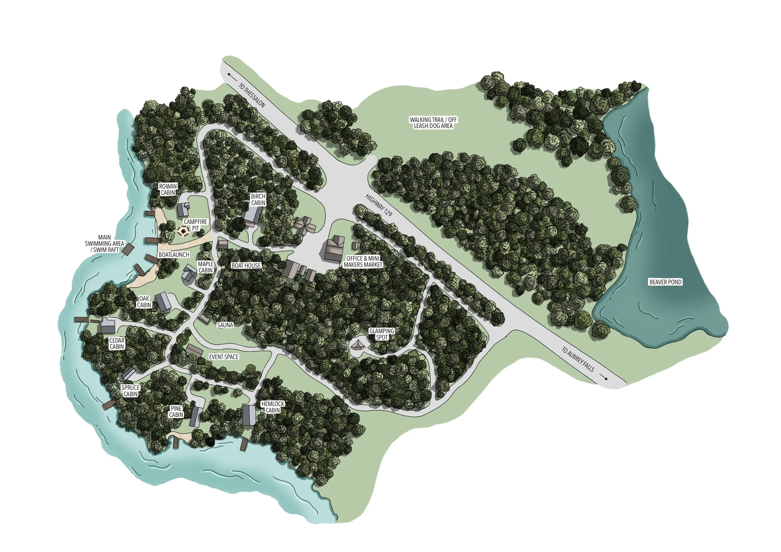 Eight nearby lakeside cabins and our luxury bell tent offer a total of 22 comfortable beds in private rooms with a shared fully equipped kitchen and bathroom with shower, providing a quiet sanctuary for event attendees to retreat to after a day of activities.